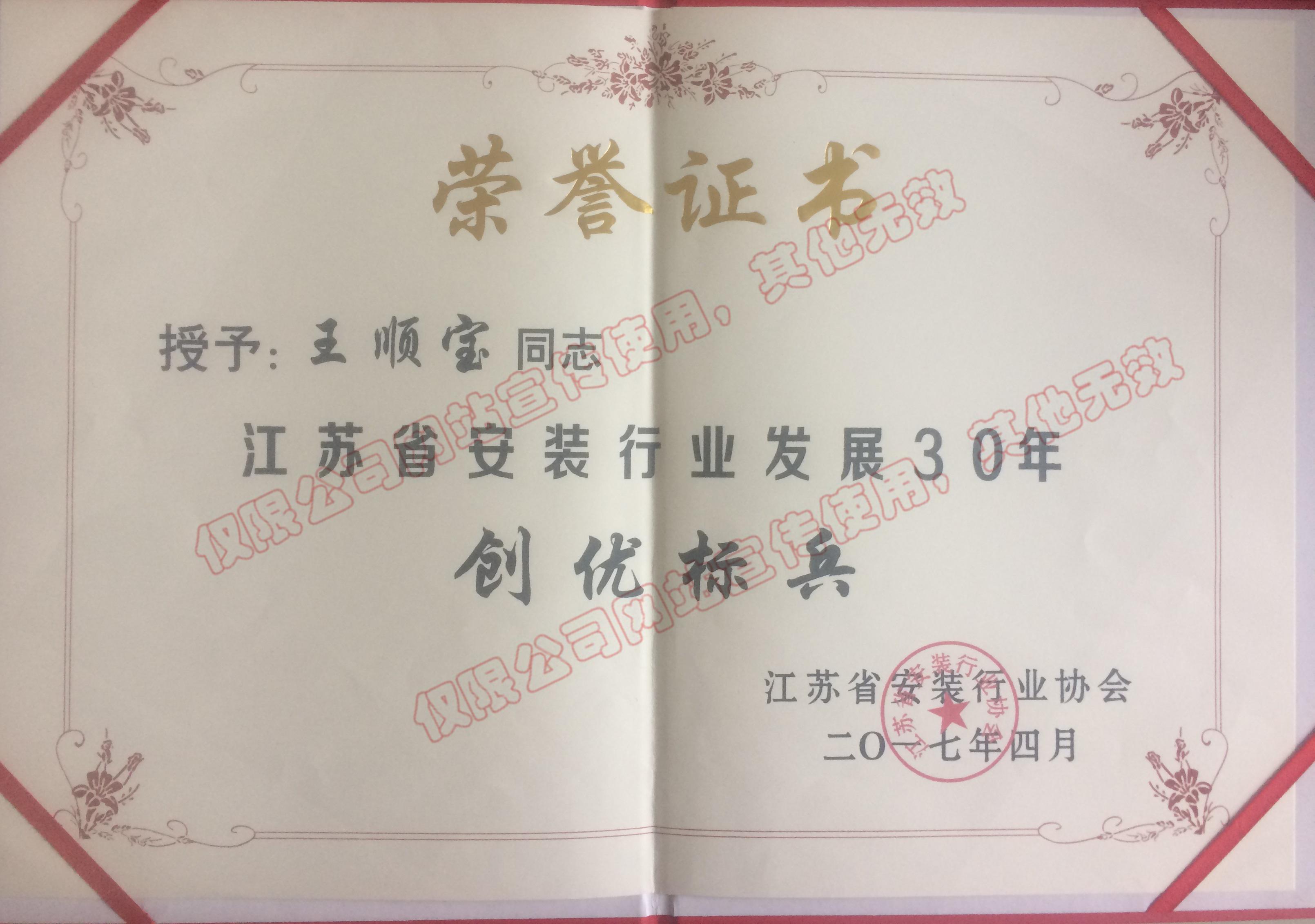 在江苏省安装行业协会成立30周年纪念活动评奖中,开云在线登录公司荣获“江苏省安装行业创优示范企业”称号,王秋明、姜中明同志荣获“江苏省安装行业模范工作者”称号,王顺宝同志荣获“江苏省安装行业创优标兵”称号,马荣生同志荣获“江苏省安装行业科技创新奖新进个人”称号。